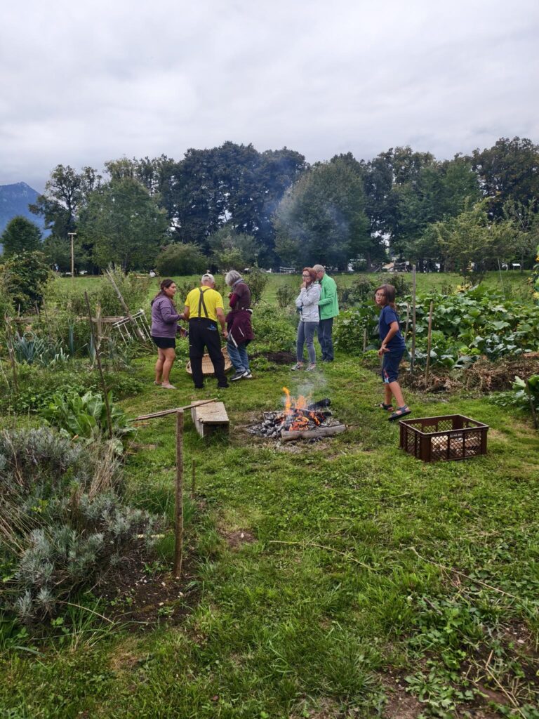 Sylvia aus der Gartengruppe: „Am Morgen dachten wir noch – oje, das fällt heute aber ins sprichwörtliche Wasser – es regnete in Strömen. Aber der Wettergott war uns hold, der Abend trocken und mild und die BesucherInnen interessiert und gesprächig. Als Jause gab es frisches Sauerteigbrot aus der Erlachmühle mit Butter und frisch geerntete Tomaten drauf. Der Muhr Franz hat noch ein selbstgemachtes Kräutersalz mitgebracht, ein Lagefeuer gemacht und die grad geernteten Erdäpfel drin gebraten. Andreas Pillichshammer hat uns einen selbstgepressten Apfelsaft spendiert. Und, das Beste zum Schlus: wir dürfen eine neue Familie in unserer Gemeinschaft begrüßen. Der Sohn war schon mal mit seiner Volkschulklasse bei uns im Garten zu Besuch und hat seitdem den Eltern davon vorgeschwärmt. Der Sommerabend hat dann wohl den letzten Anstoß gegeben, wirklich bei uns mitzumachen.