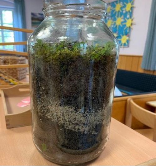 Begleitet wurde dieser Prozess durch eine vorbereitete Lernumgebung rund um das Thema Boden und Regenwürmer. Um den natürlichen Lebensraum der Tiere nachzuahmen, bastelten die Kinder aus schwarzem Tonpapier eine Verdunkelung für das Terrarium, da es auch in der Erde dunkel ist. Durch Bücher, Gespräche und gemeinsames Nachdenken vertieften sie ihr Sachwissen und entwickelten ein zunehmend differenziertes Verständnis für die Bedeutung der Regenwürmer im Boden.