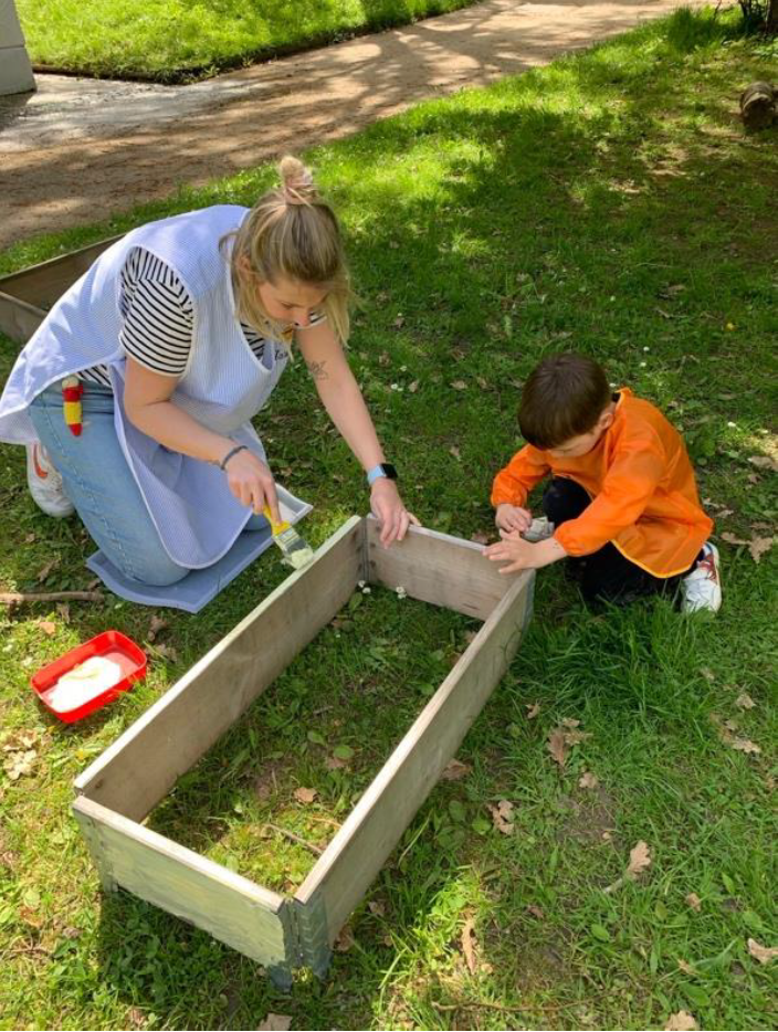 Anschließend wurde das Hochbeet gemeinsam mit den Kindern vorbereitet: Die Kinder bemalten es, füllten es mit Erde und richteten es liebevoll her. Die gesammelten Regenwürmer wurden samt der bereits aufbereiteten Erde aus dem Terrarium in das Hochbeet entlassen. Um zu verhindern, dass die Tiere den Bereich verlassen, wurde das Beet zusätzlich mit Vlies ausgekleidet.