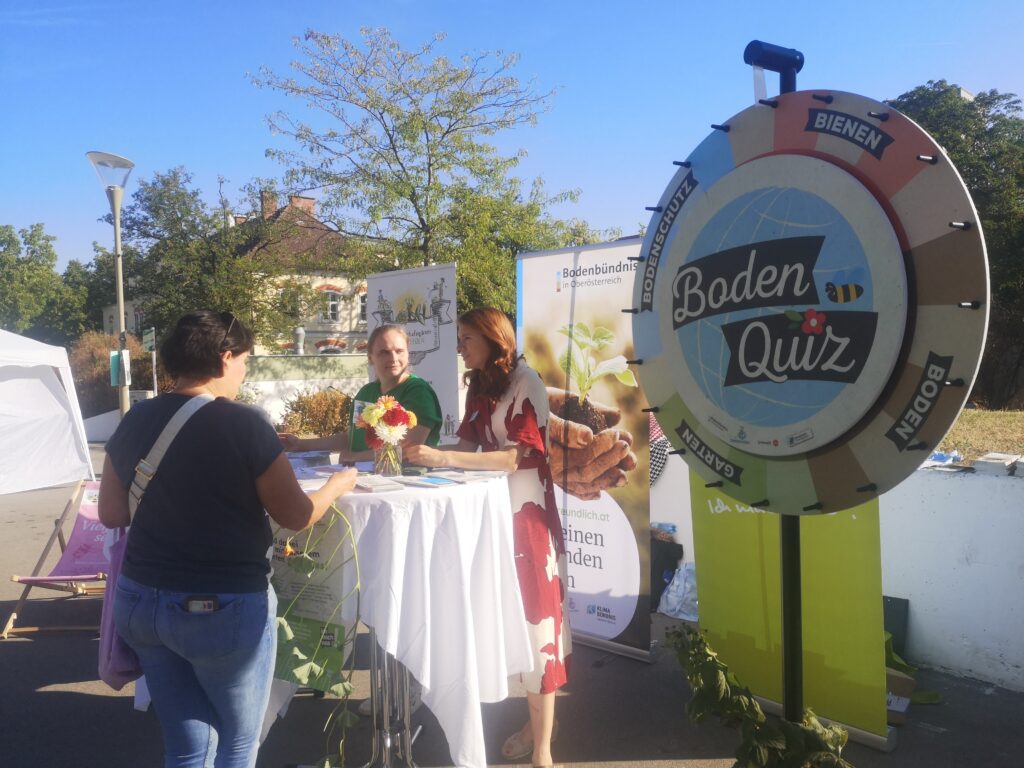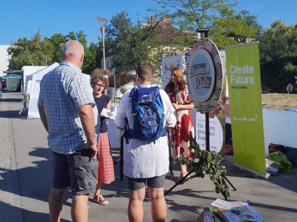 Über die Früchte der gemeinsamen Arbeit haben Klimabündnis OÖ und youngCaritas OÖ im September auch die oberösterreichische Bevölkerung bei einem Stand am Linzer Südbahnhofmarkt informiert. Bei herrlichem Wetter und guter Laune konnten sich die Marktbesucher:innen über soziale und ökologische Projekte informieren und ihr Wissen über Klima- und Bodenschutz beim Quizrad austesten.