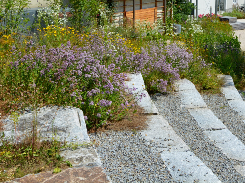 Die Bepflanzung ist spärlich bis gar nicht vorhanden und oft werden Pflanzen ausgewählt, die keine Nahrung für Tiere und Insekten zur Verfügung stellen. Auf diesen Flächen siedeln sich flugfähige Samen von Pflanzen an, die ungewünscht sind und oftmals mit Pestiziden bekämpft werden. Wiesengesellschaften und Wildblumenbeete sind im Vergleich dazu sehr lebendig und artenreich und geben vielen Lebewesen eine Nische zum Wohnen. Schotter ist nicht gleich Schotter.